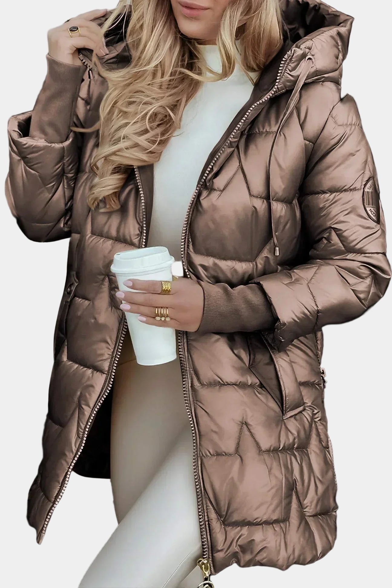 • Corte largo y capucha envolvente: protege del frío y estiliza la silueta.